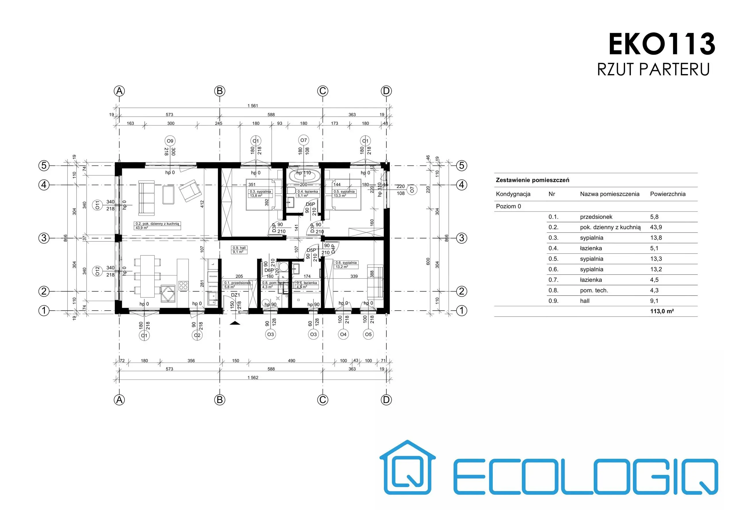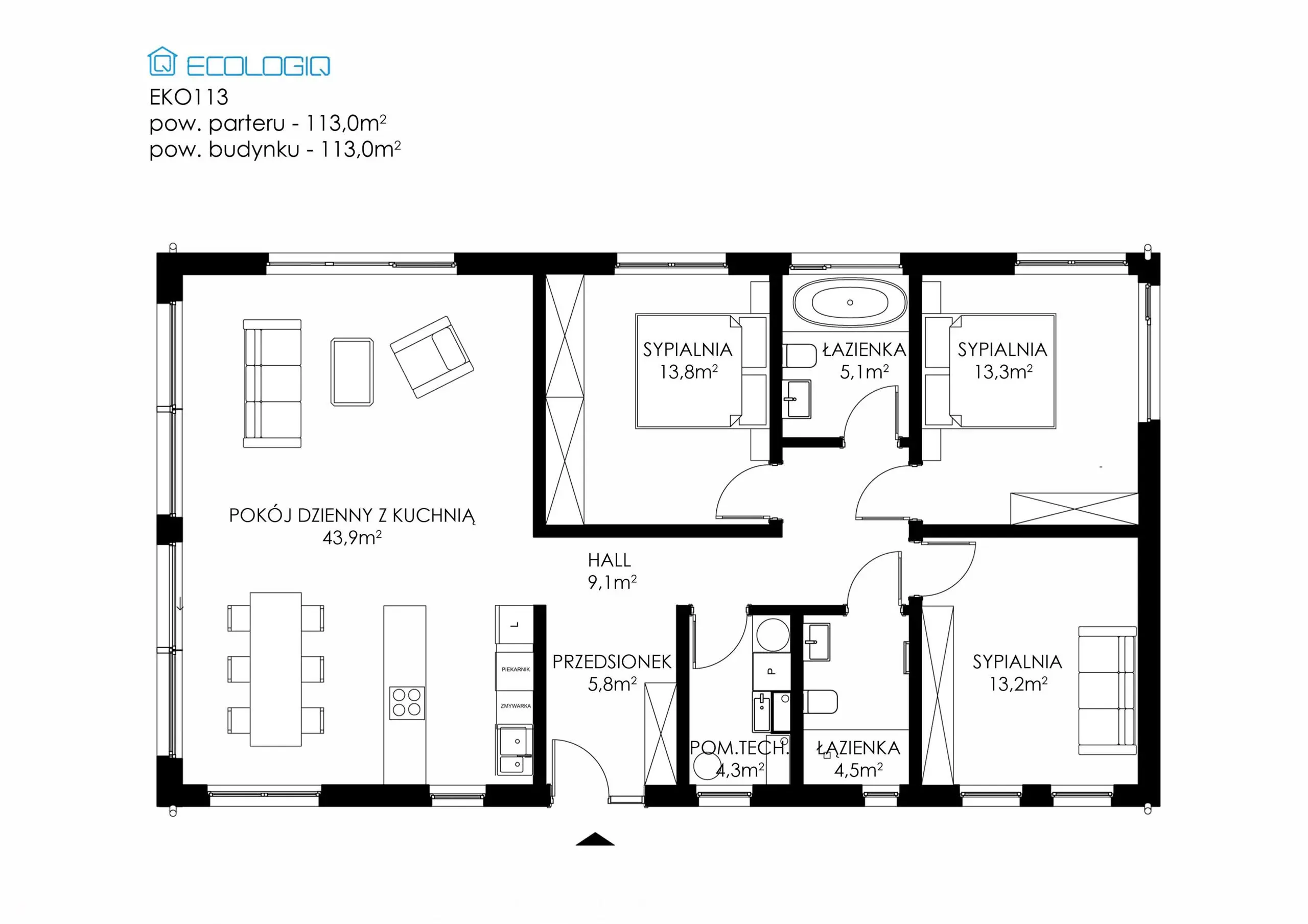 Ten parterowy dom oferuje funkcjonalny układ pomieszczeń na który składają się trzy równe sypialnie, dwie łazienki, przestronny salon z jadalnią i kuchnią, przedpokój i pomieszczenie gospodarcze. Pomieszczenia zostały starannie zaprojektowane z myślą o maksymalnym wykorzystaniu dostępnej przestrzeni, zapewniając zarówno wygodę, jak i funkcjonalność.