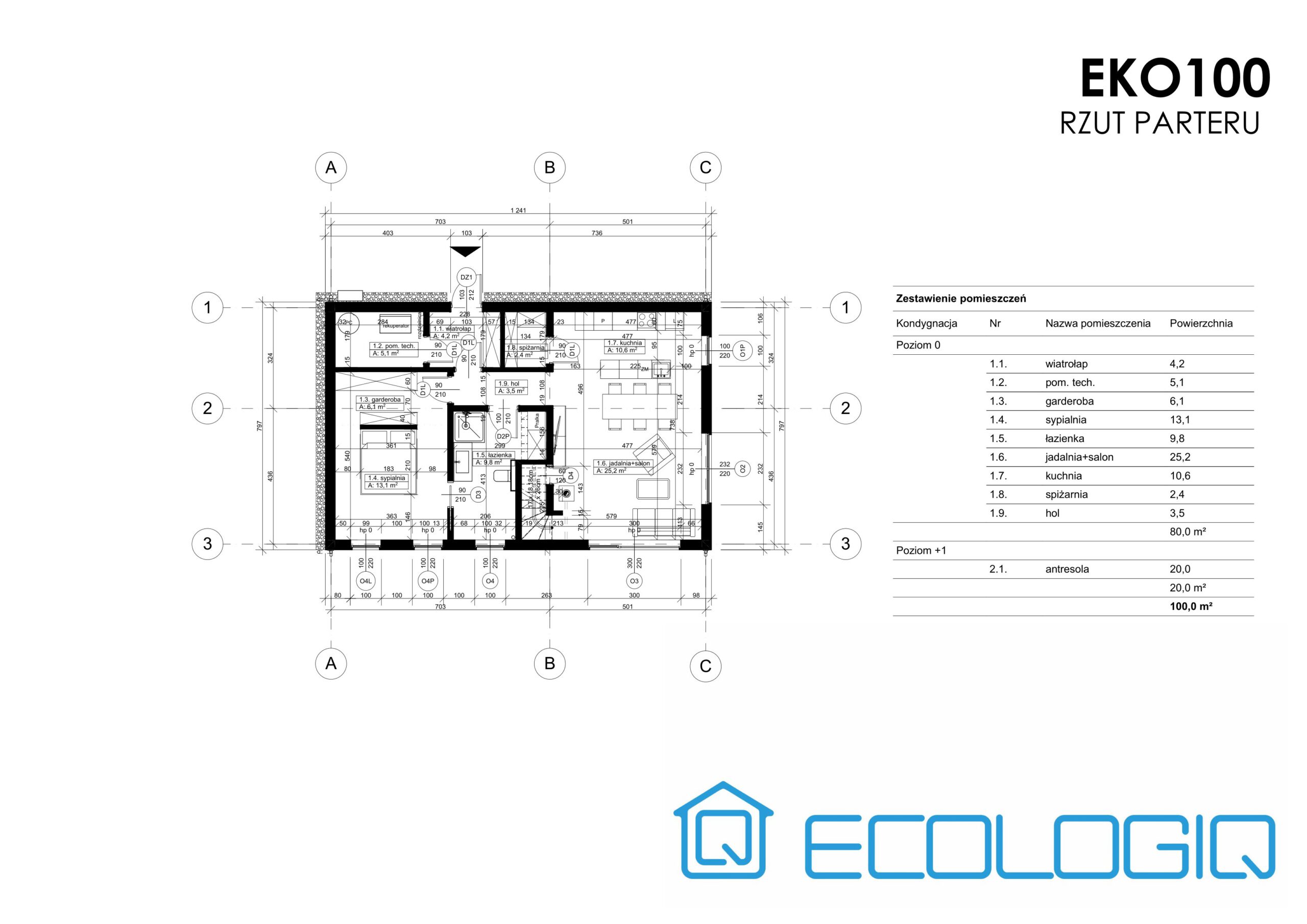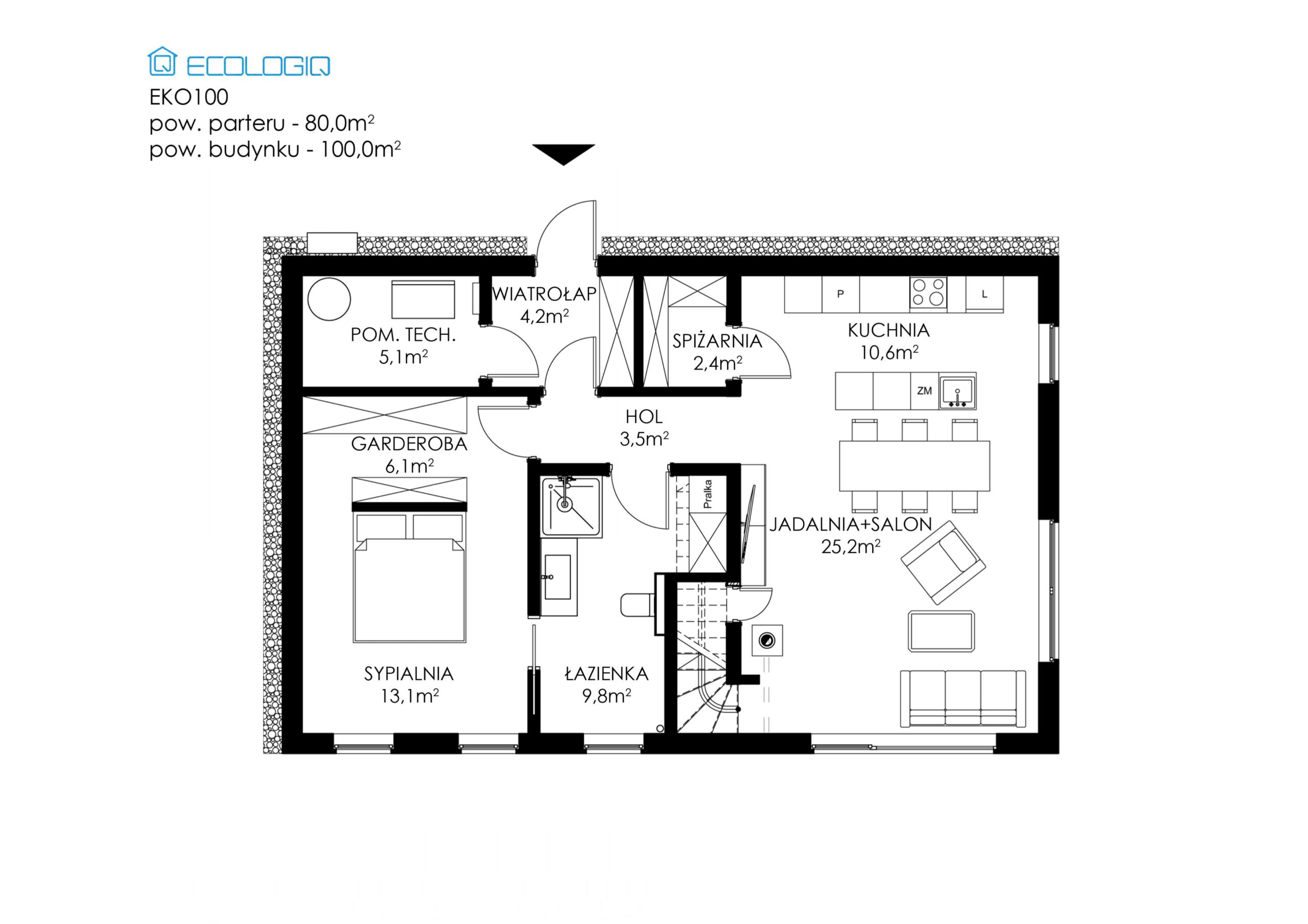 Na układ funkcjonalny składa się przestronny salon z jadalnią (25,2 m²), kuchnia ze spiżarnią (13 m²), duża sypialnia (13,1 m² ) z garderobą (6,1 m² ) i bezpośrednim przejściem do pokoju kąpielowego (9,8 m²). Dodatkowo na parterze zaprojektowano wygodne pomieszczenie techniczne (5,1 m² ), wiatrołap (4,2 m²) z miejscem na zabudowę oraz hol (3,5 m²).