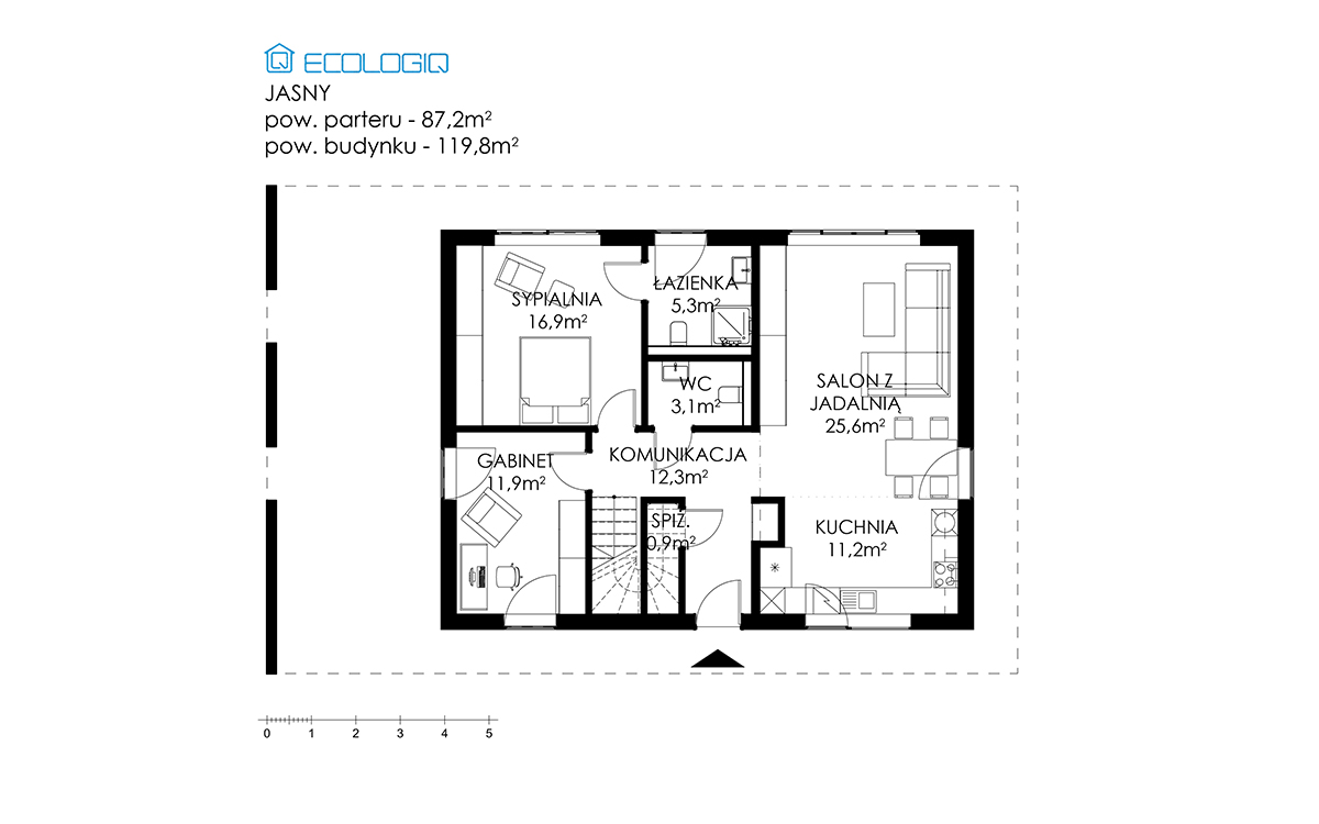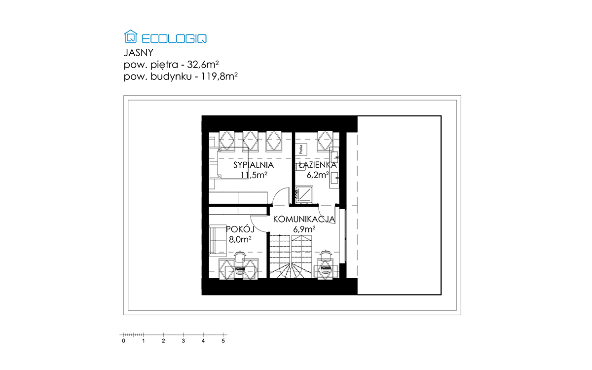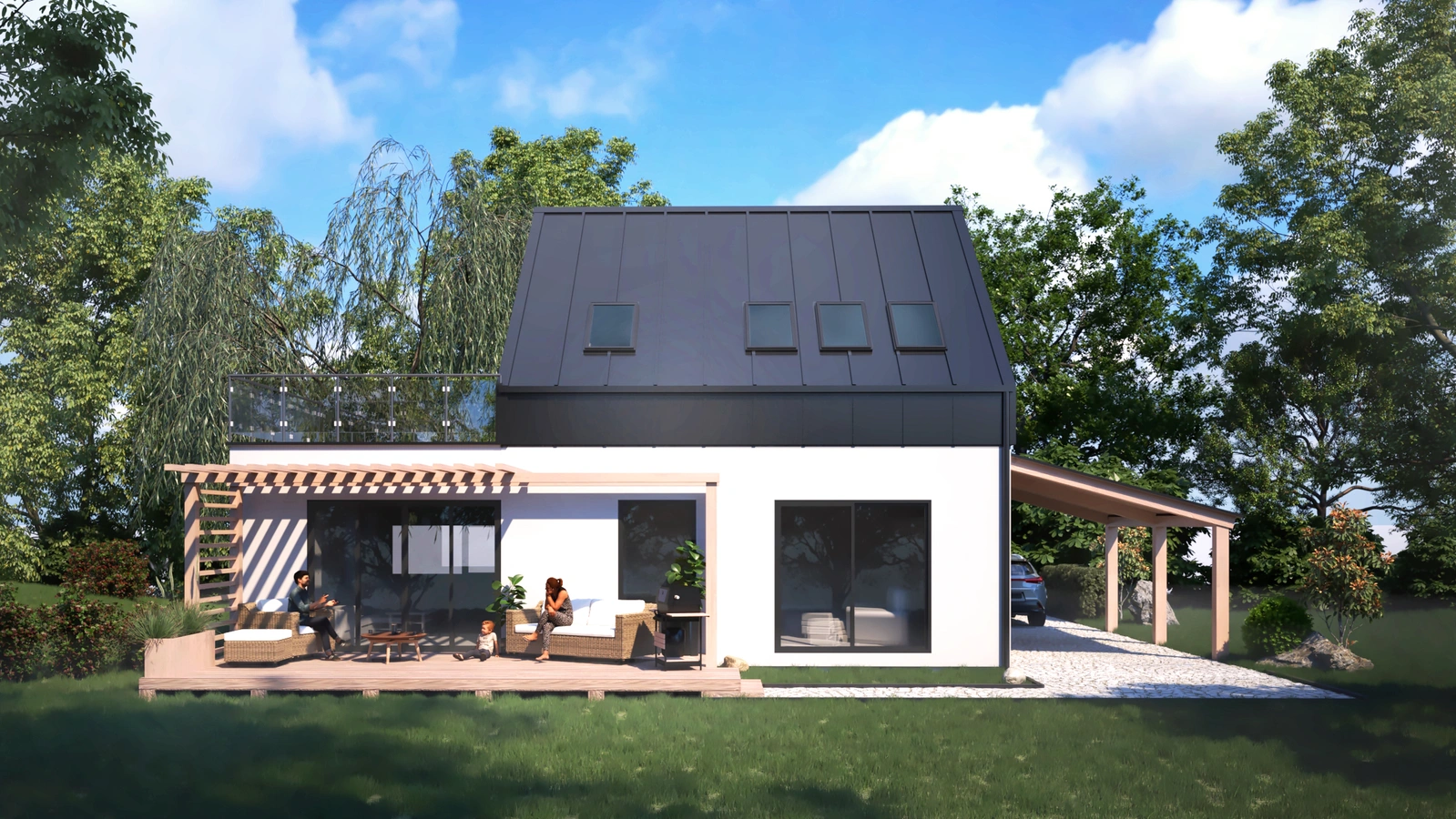 Interesujący projekt nowoczesnego, parterowego domu prefabrykowanego z nadbudówką zaprojektowanego dla jednego z naszych klientów. Na parterze budynku przewidziano: przestronny salon z kuchnią i jadalnią, łazienkę, biuro oraz pomieszczenie techniczne. Na poddaszu zostały umiejscowione: dwie sypialnie, łazienka oraz garderoba. Zastosowana forma architektoniczna pozwoliła na wygenerowanie przestronnego tarasu na piętrze oraz wydzielenie jednego miejsca postojowego dla samochodu. Wybierając nasze ekologiczne domy z prefabrykatów chronisz środowisko naturalne.