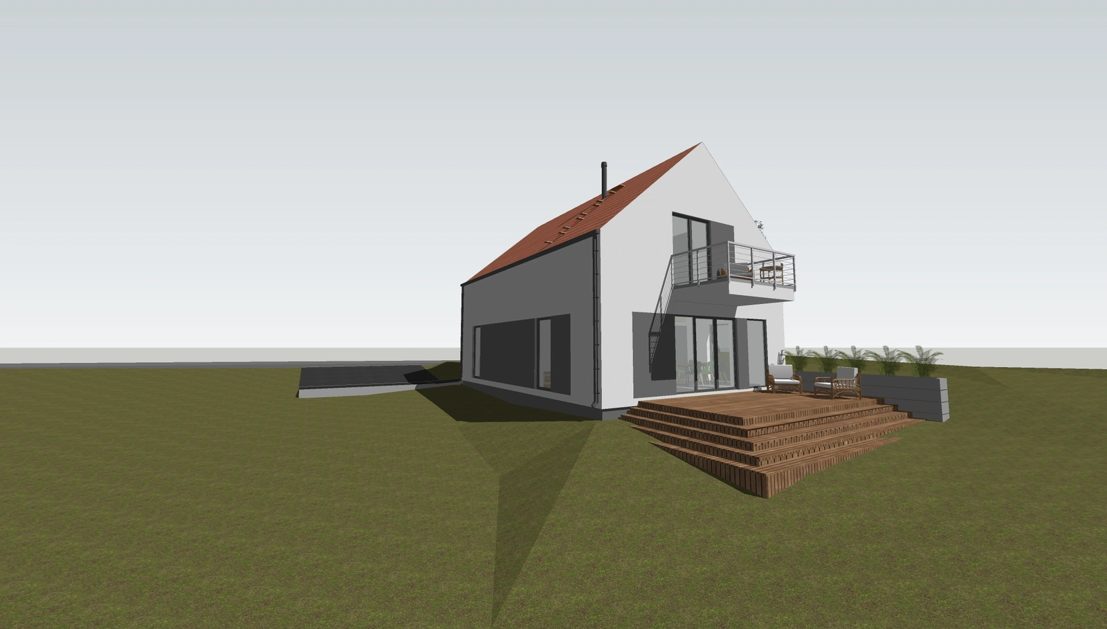 Projekt nowoczesnego domu prefabrykowanego z użytkowym poddaszem spełniającego potrzeby 3-4 osobowej rodziny, który pomimo niewielkiego metrażu zapewnia wysoki komfort użytkowania. Na parterze budynku znajdziemy wygodną strefę dzienną wraz z półotwartą kuchnią, łazienkę, obszerne pomieszczenie techniczne spełniające potrzeby pralni wraz z suszarnią oraz niewielki gabinet, który może również pełnić funkcję pokoju gościnnego. Na poddaszu zlokalizowano strefę nocną z dwoma pokojami, dużą łazienką oraz intymną sypialnią posiadającą odrębną garderobę oraz wyjście na balkon.