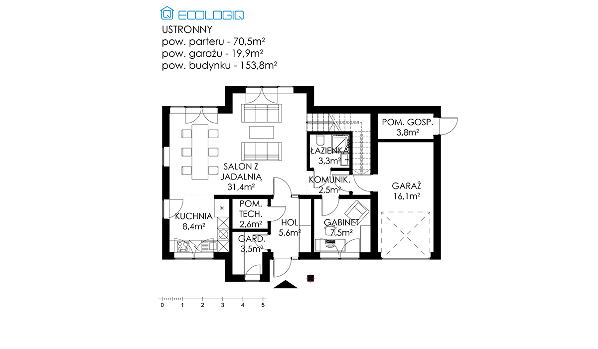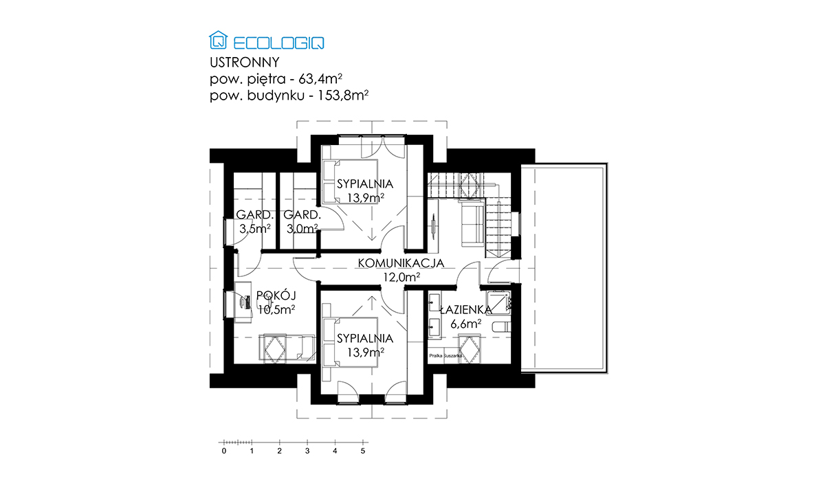 Interesujący projekt jednorodzinnego domu prefabrykowanego z użytkowym poddaszem. Na parterze do dyspozycji użytkowników przewidziano przestronny salon z jadalnią i otwartą kuchnią, pokój gościnny, łazienkę, garderobę oraz pomieszczenie techniczne. Dodatkowe pomieszczenie gospodarcze zostało usytuowane za garażem. Użytkowe poddasze mieści: trzy sypialnie, dwie garderoby oraz łazienkę. Nad garażem zaprojektowano przestronny taras.