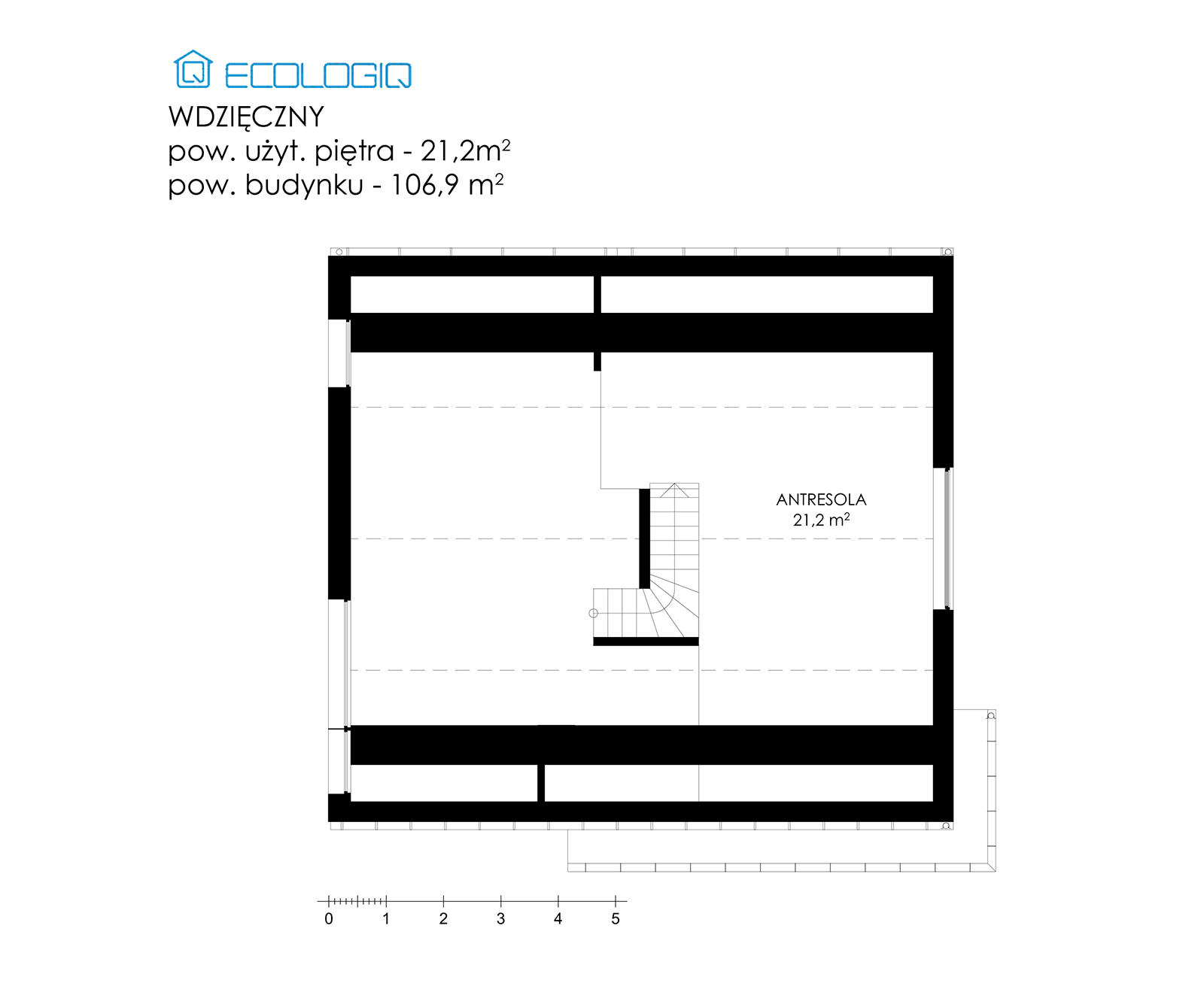Indywidualny projekt koncepcyjny jednorodzinnego, nowoczesnego domu prefabrykowanego. W budynku wyodrębnione zostały następujące pomieszczenia: pokój gościnny, duża łazienka z wanną, pomieszczenie gospodarcze, obszerna sypialnia, jadalnia i otwarta kuchnia. Ponadto nasz ekologiczny budynek posiada przestronny pokój dzienny, z którego istnieje możliwość wejścia do antresoli.