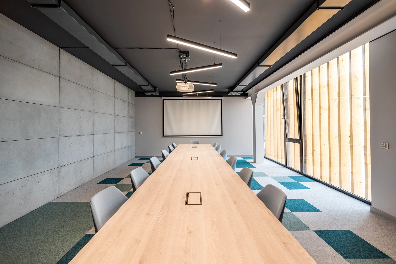 Budynek CBR wykonaliśmy w technologii prefabrykowanej Ecologiq, przy wykorzystaniu ściany zewnętrznej o grubości 34 cm oraz dachu płaskiego 40 cm. Cały obiekt zaprojektowaliśmy i wybudowaliśmy zgodnie z normami przewidzianymi na 2021 rok, co oznacza, iż jego zapotrzebowanie na energię cieplną wynosi poniżej 40 kWh/(m2·rok). Standardowym rozwiązaniem, które stosujemy budując piętrowe budynki użyteczności publicznej jest umieszczenie wylewek betonowych na stropach. Działanie to nie tylko poprawia akustykę obiektu, ale i ogólny komfort jego użytkowania.