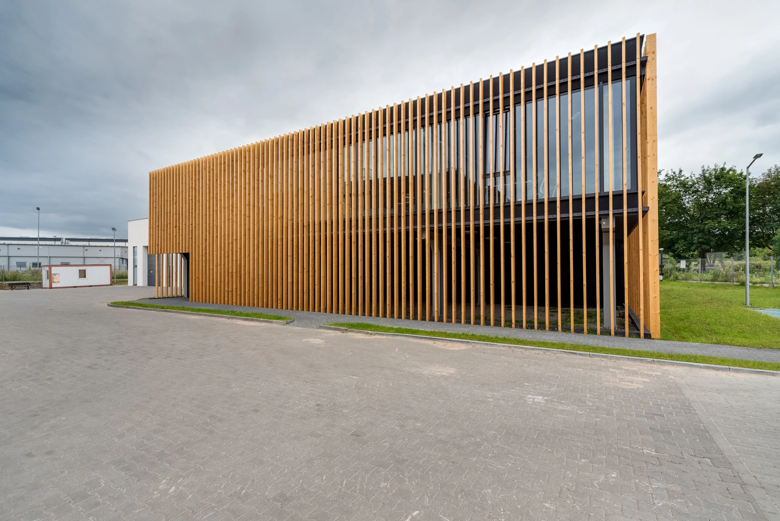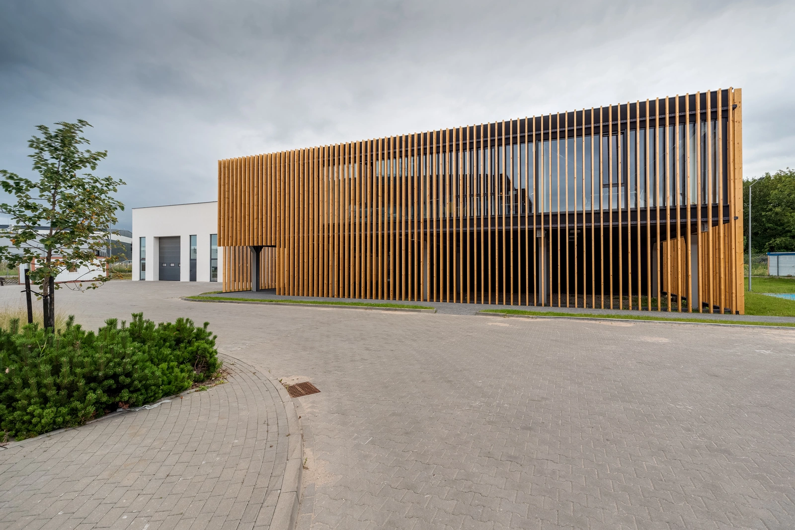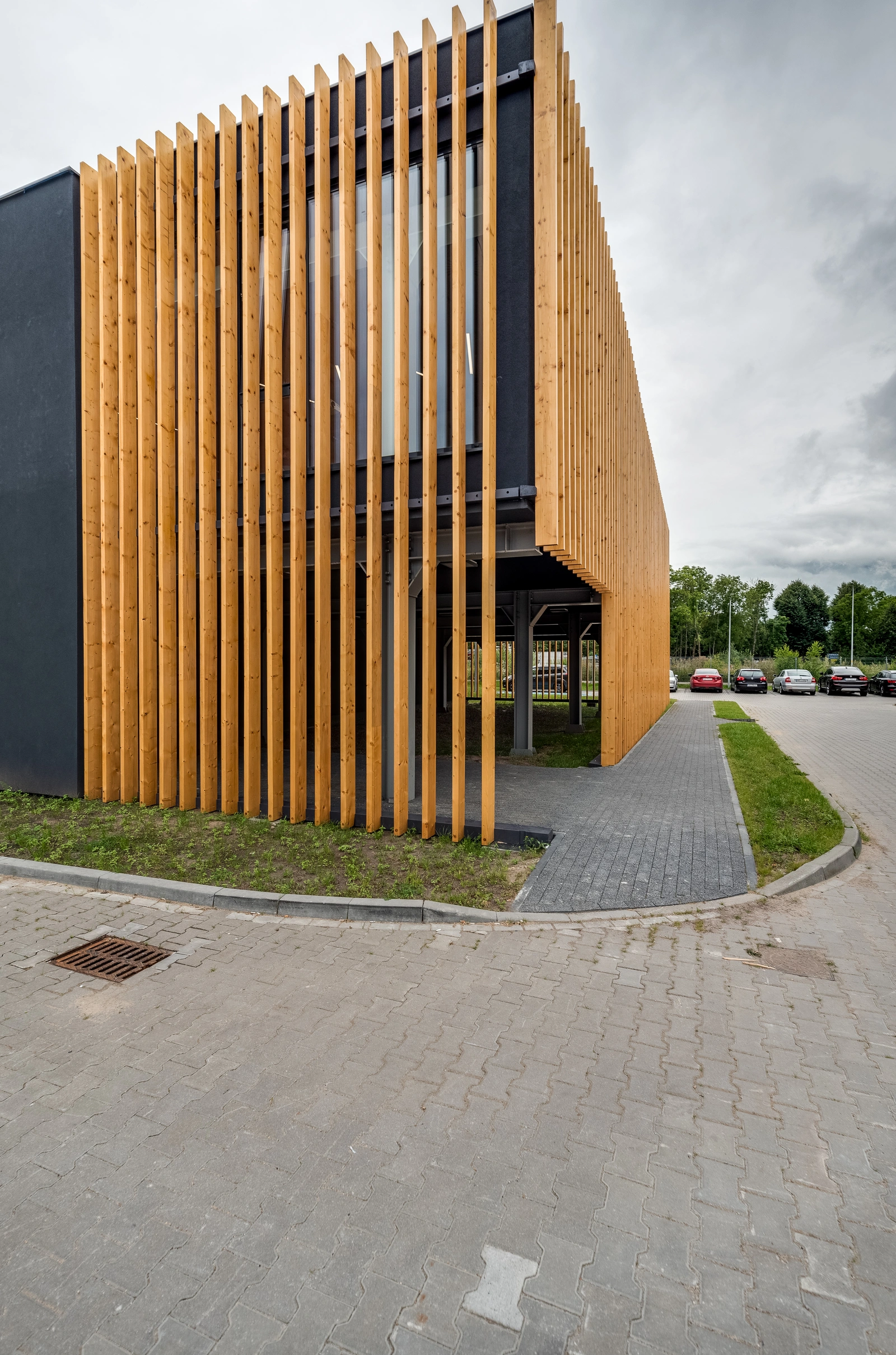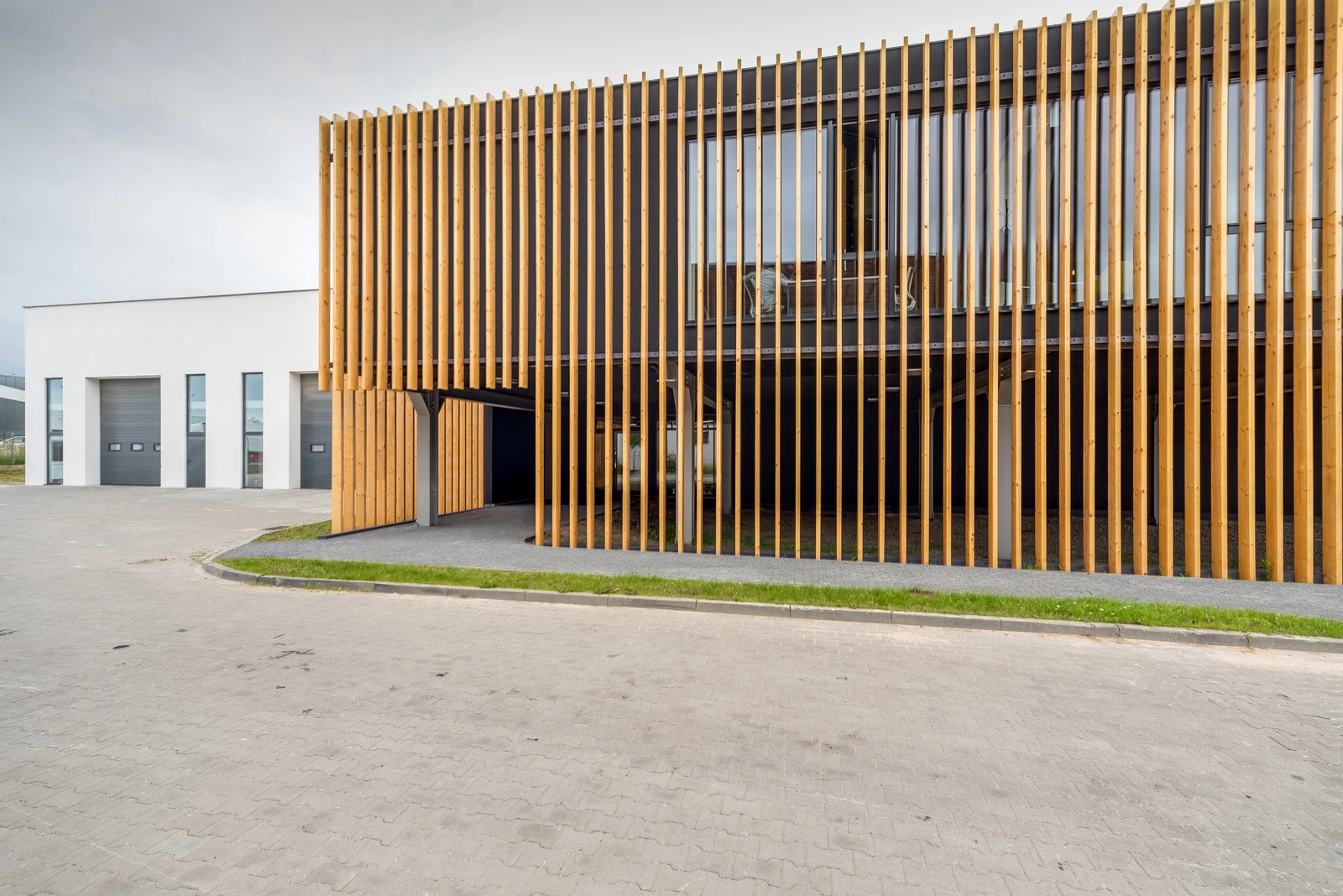 Interesującym rozwiązaniem projektowym są również niewątpliwie drewniane „żyletki” elewacyjne. To tak zwane „światłołamacze”, czyli zewnętrzny system przeciwsłoneczny, który w okresie letnim dodatkowo zabezpiecza budynek przed przegrzaniem promieniami słonecznymi. Dzięki zastosowaniu takiego rozwiązania energooszczędny budynek biurowy nie posiada klimatyzacji, co w niewątpliwy sposób podnosi komfort jego użytkowania a przy okazji zapewnia niecodzienny efekt wizualny wyróżniający obiekt pośród otoczenia.