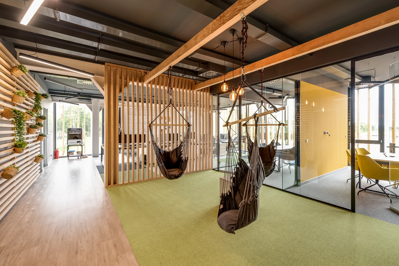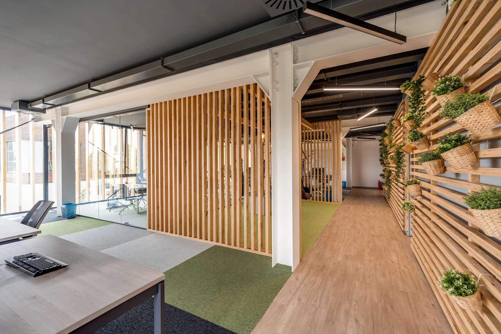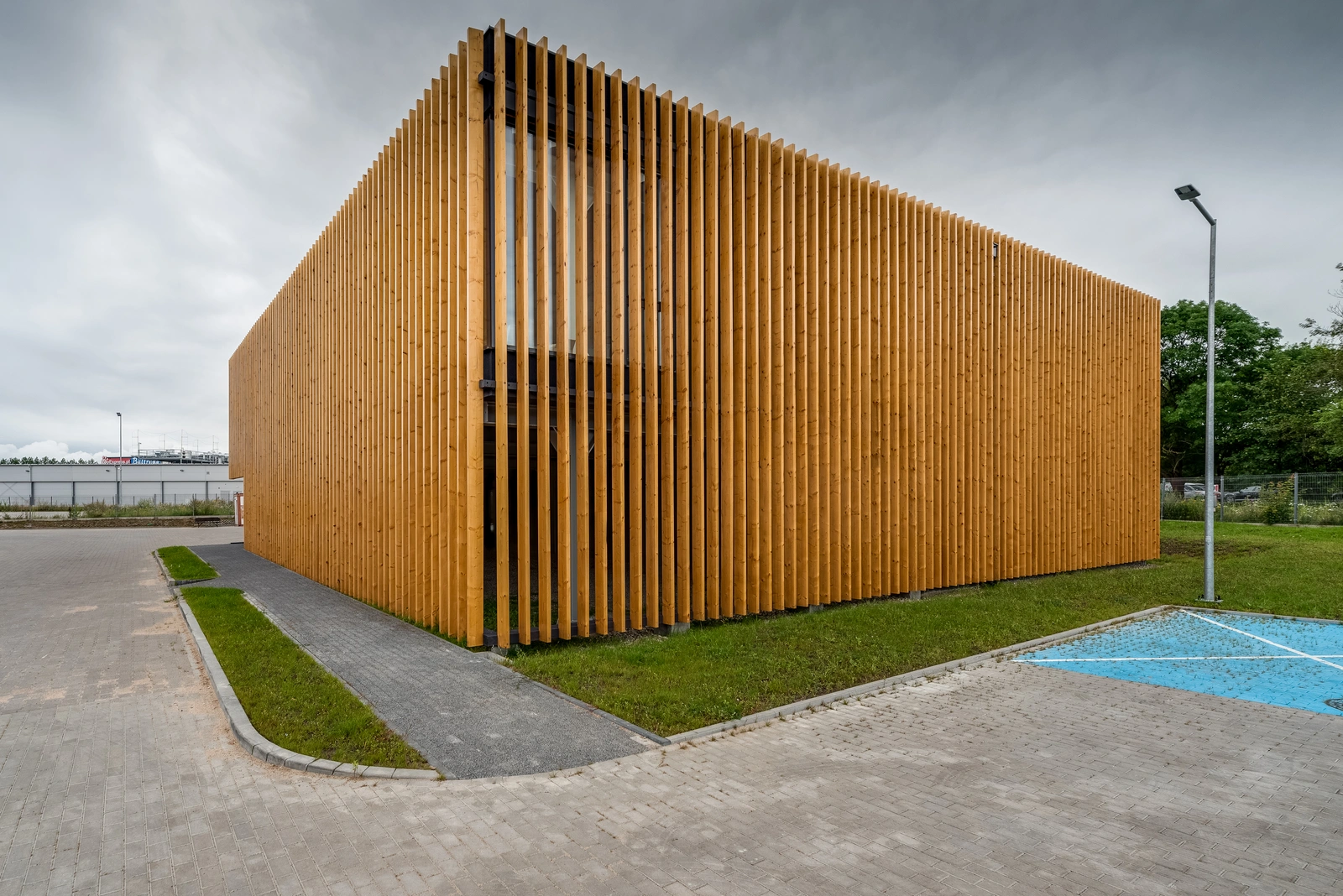 Interesującym rozwiązaniem projektowym są również niewątpliwie drewniane „żyletki” elewacyjne. To tak zwane „światłołamacze”, czyli zewnętrzny system przeciwsłoneczny, który w okresie letnim dodatkowo zabezpiecza budynek przed przegrzaniem promieniami słonecznymi. Dzięki zastosowaniu takiego rozwiązania energooszczędny budynek biurowy nie posiada klimatyzacji, co w niewątpliwy sposób podnosi komfort jego użytkowania a przy okazji zapewnia niecodzienny efekt wizualny wyróżniający obiekt pośród otoczenia.