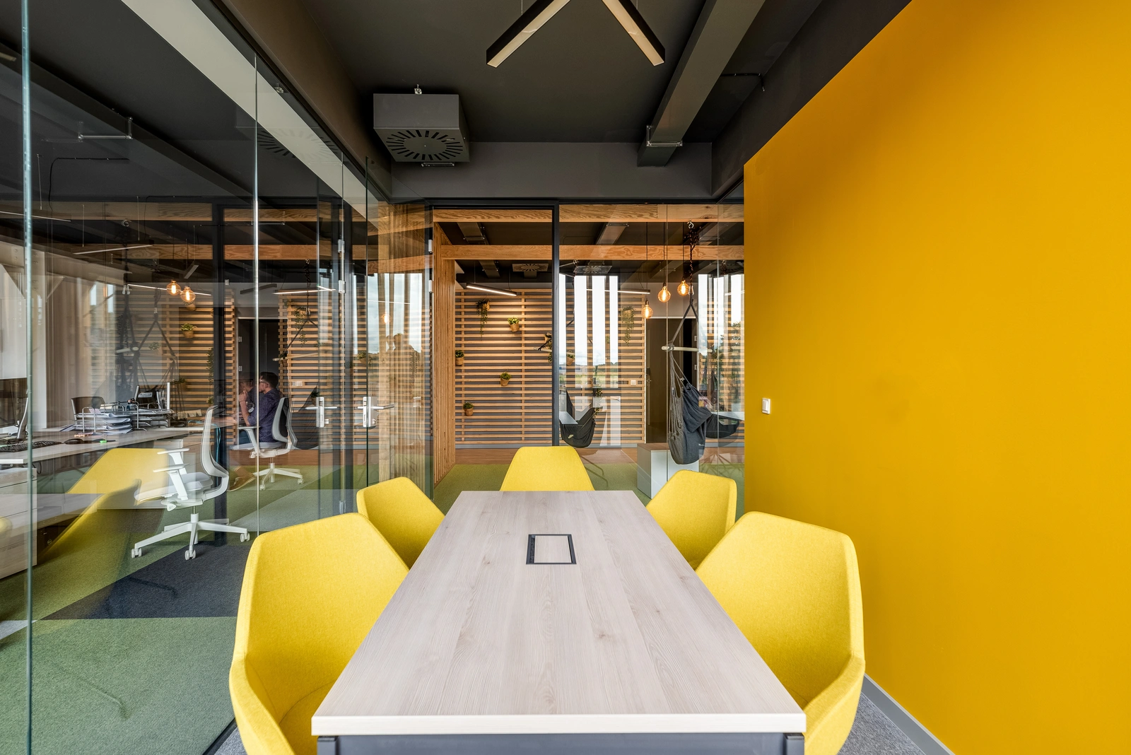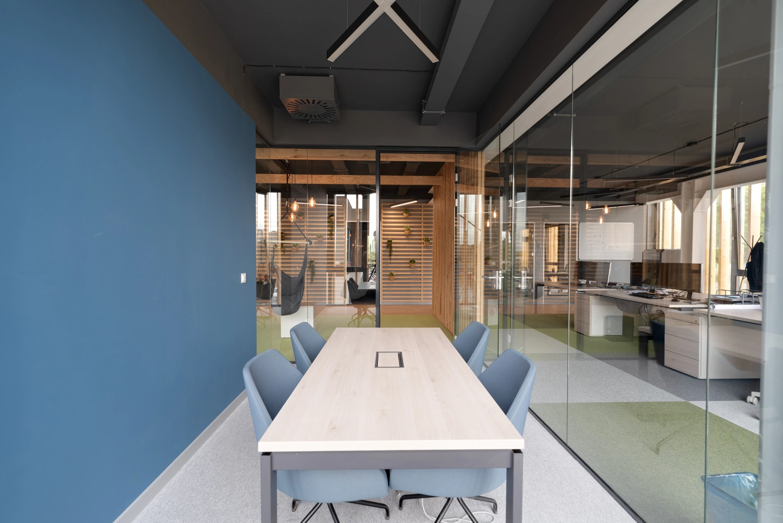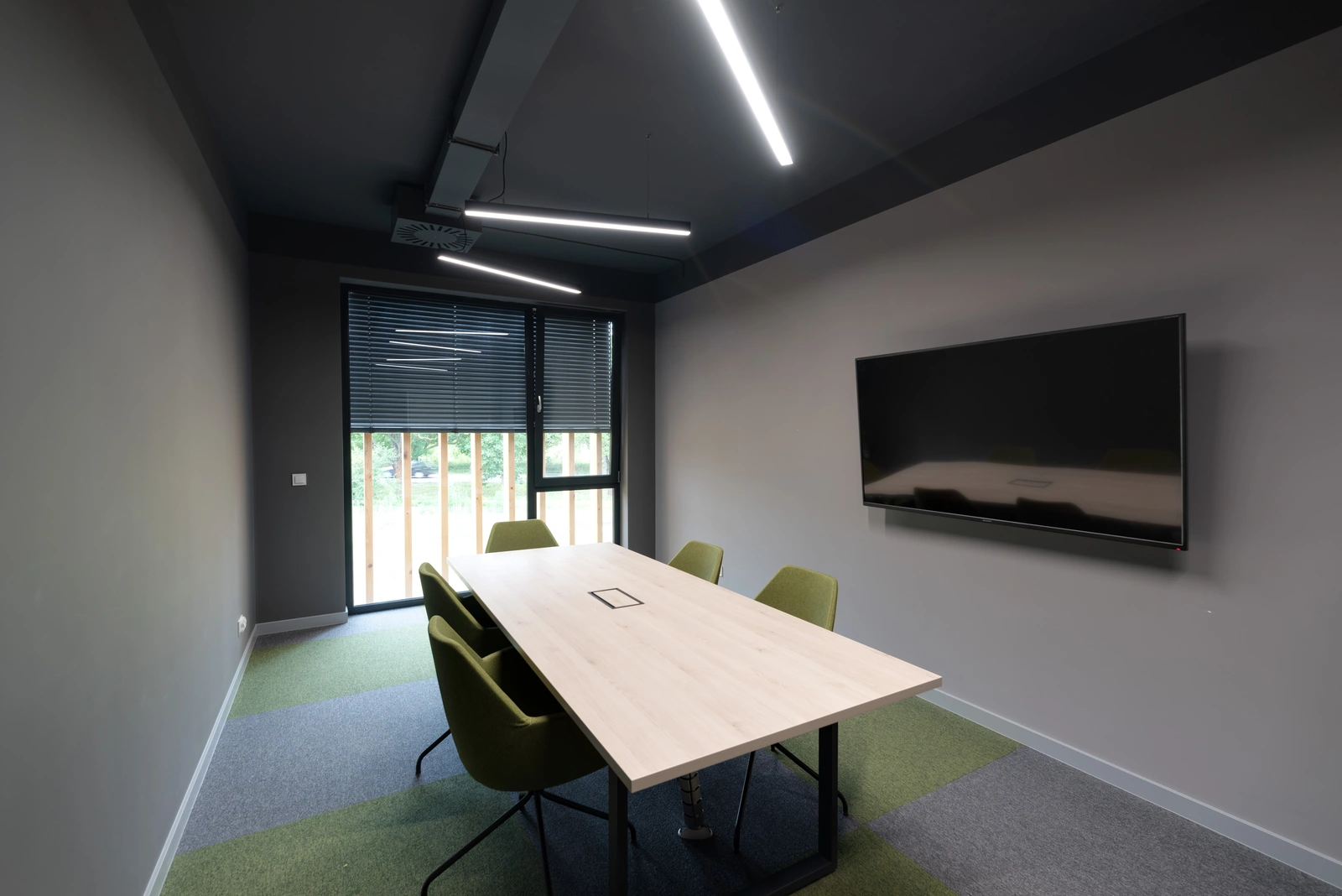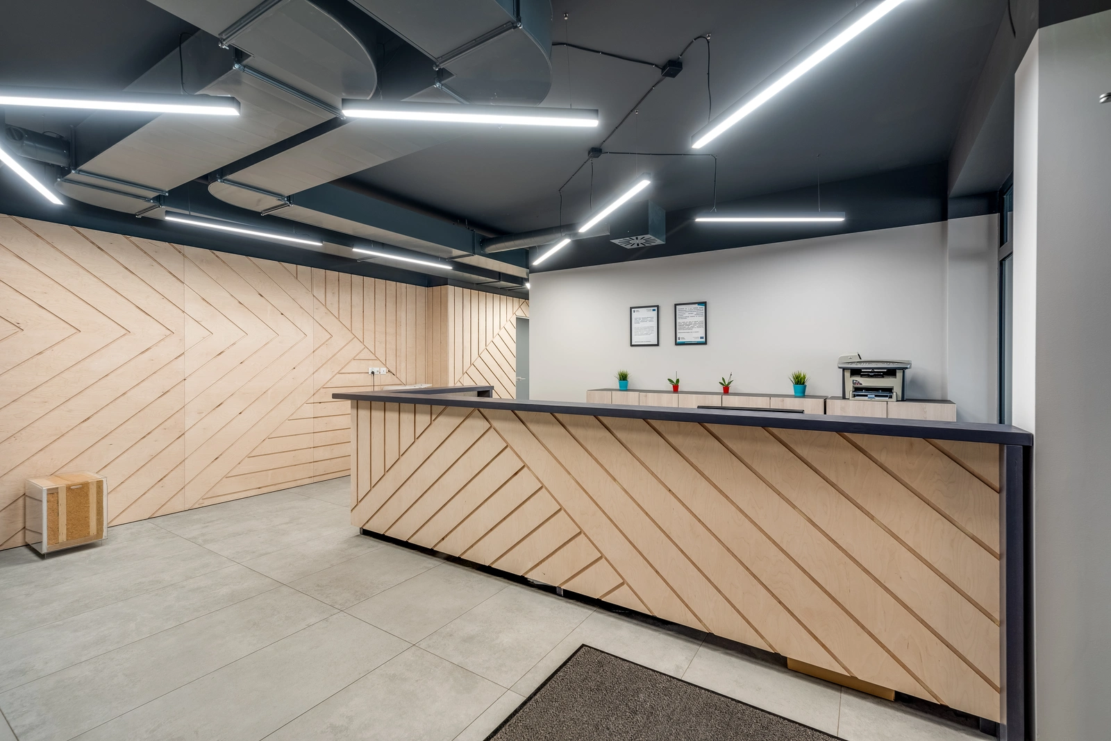 Interesującym rozwiązaniem projektowym są również niewątpliwie drewniane „żyletki” elewacyjne. To tak zwane „światłołamacze”, czyli zewnętrzny system przeciwsłoneczny, który w okresie letnim dodatkowo zabezpiecza budynek przed przegrzaniem promieniami słonecznymi. Dzięki zastosowaniu takiego rozwiązania energooszczędny budynek biurowy nie posiada klimatyzacji, co w niewątpliwy sposób podnosi komfort jego użytkowania a przy okazji zapewnia niecodzienny efekt wizualny wyróżniający obiekt pośród otoczenia.