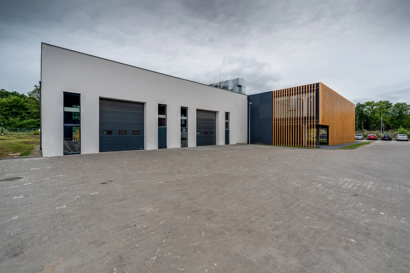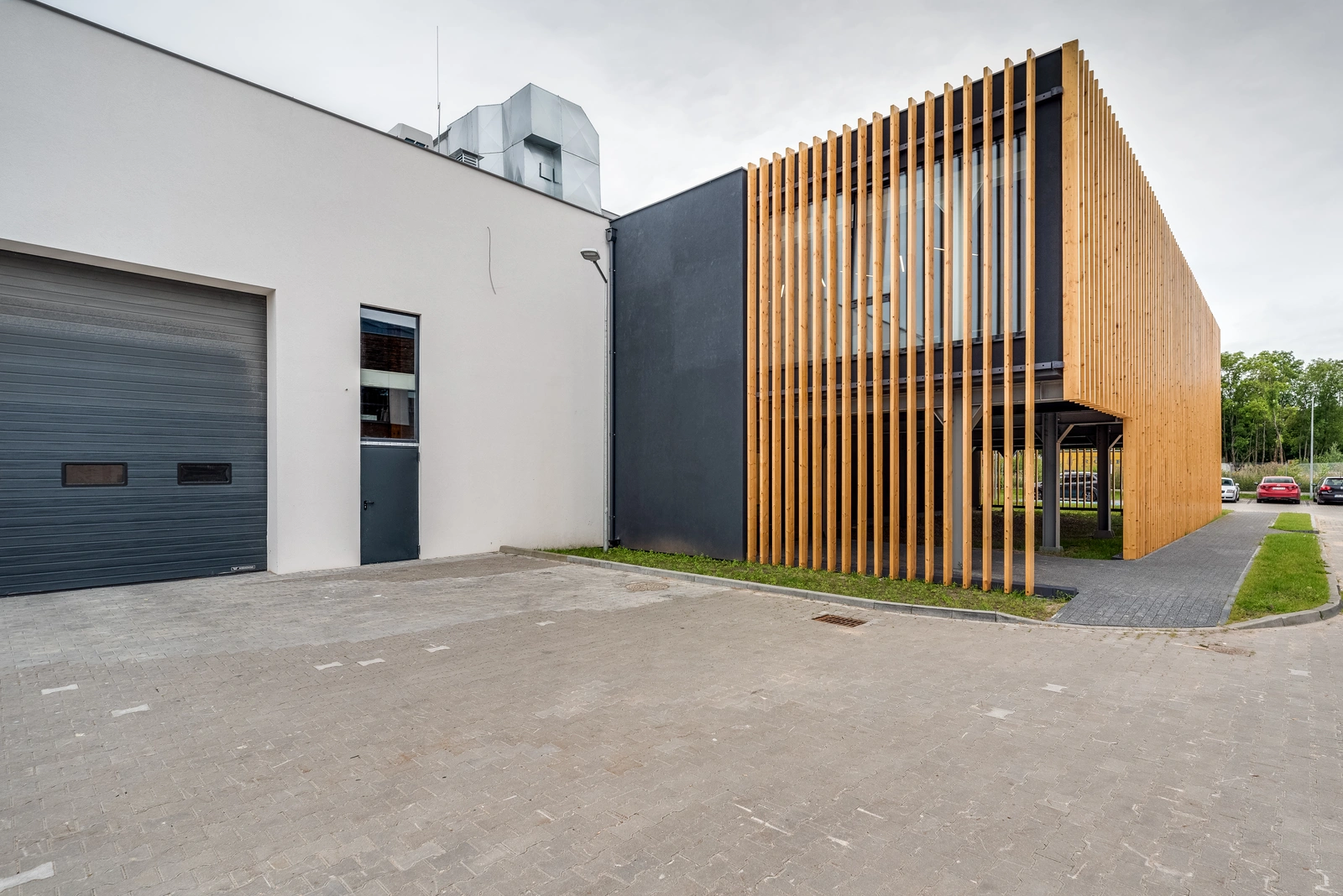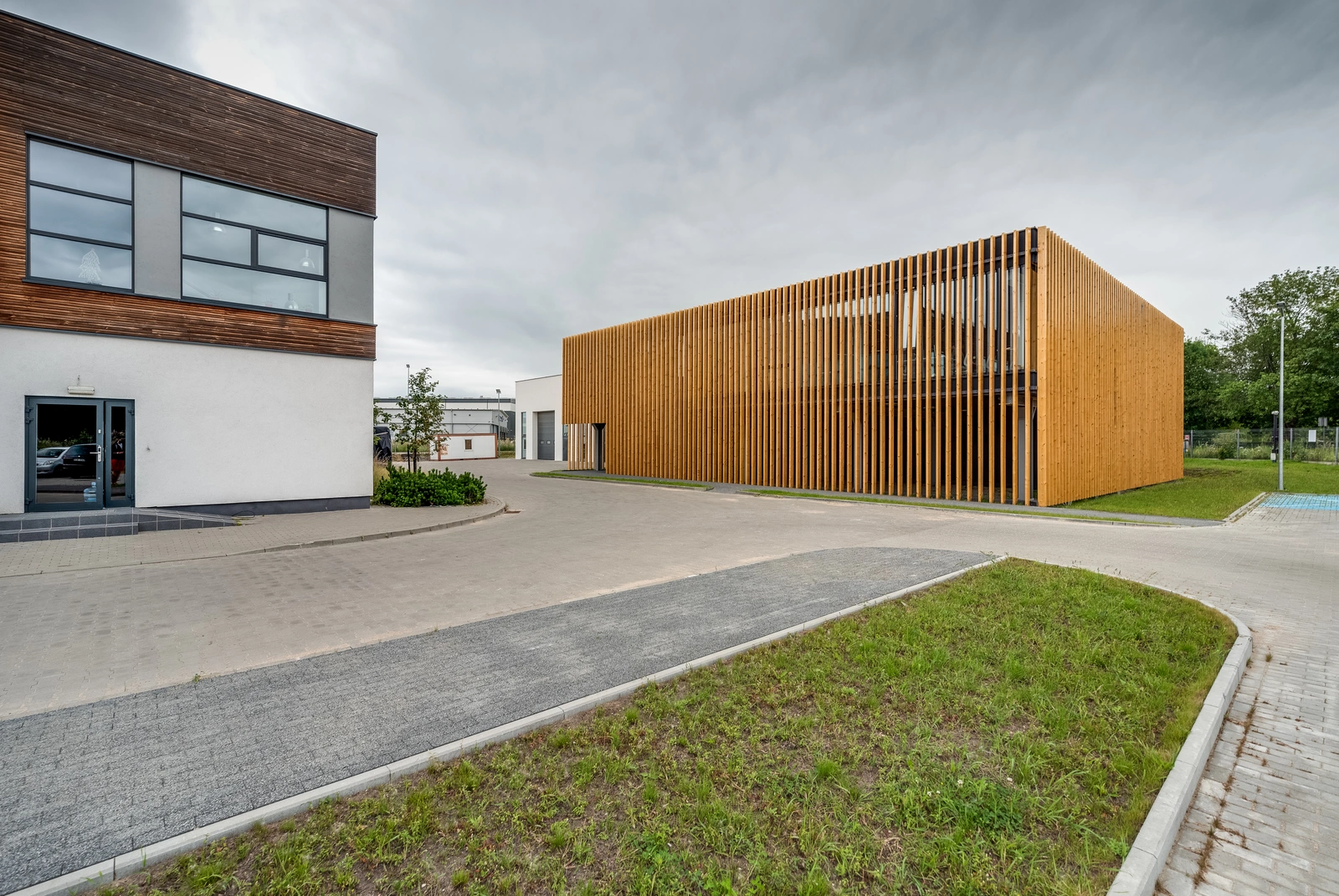 Przy energooszczędnym obiekcie biurowym znajduje się część laboratoryjna składająca się z dwóch hal badawczych o łącznej powierzchni blisko 300 mkw. W tej części obiektu nie umieściliśmy żadnych podpór, a cała przestrzeń wolna jest od wszelkich przeszkód, co umożliwia ewentualne przystosowanie jej pod tzw. małą produkcję czy magazyny podręczne. Podobnie jak w przypadku części biurowej, strefę laboratoryjną prefabrykowanego budynku zaprojektowano i wykonano jako w pełni energooszczędną.