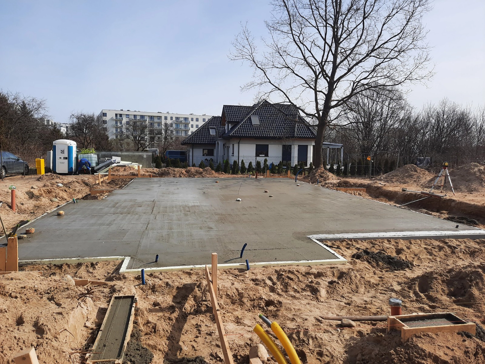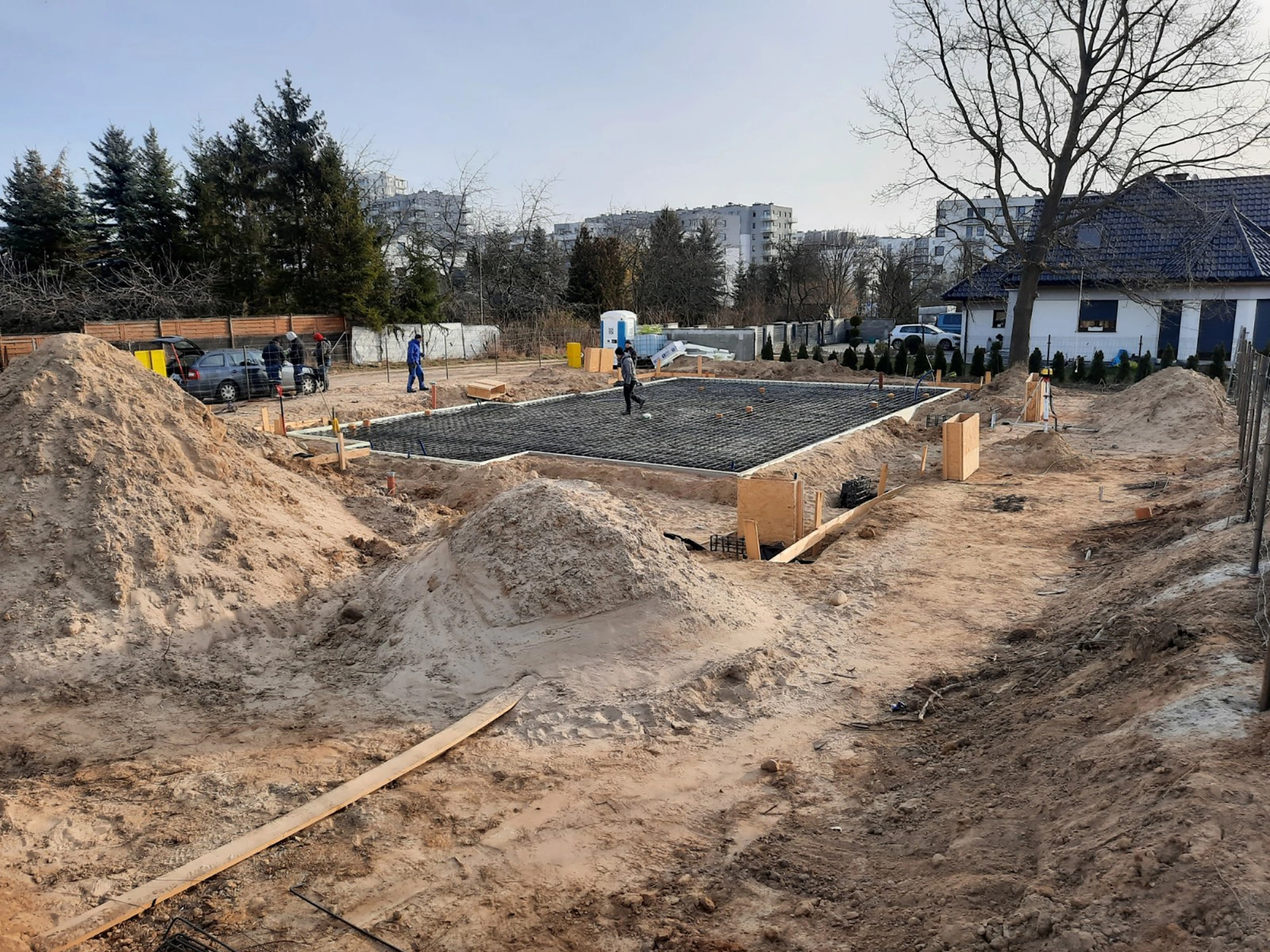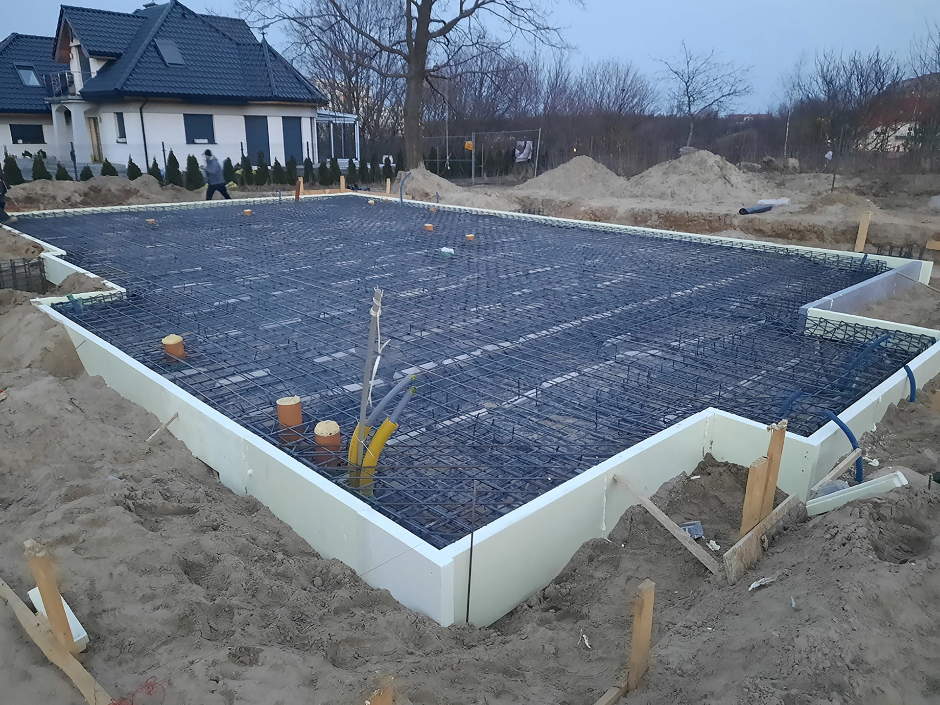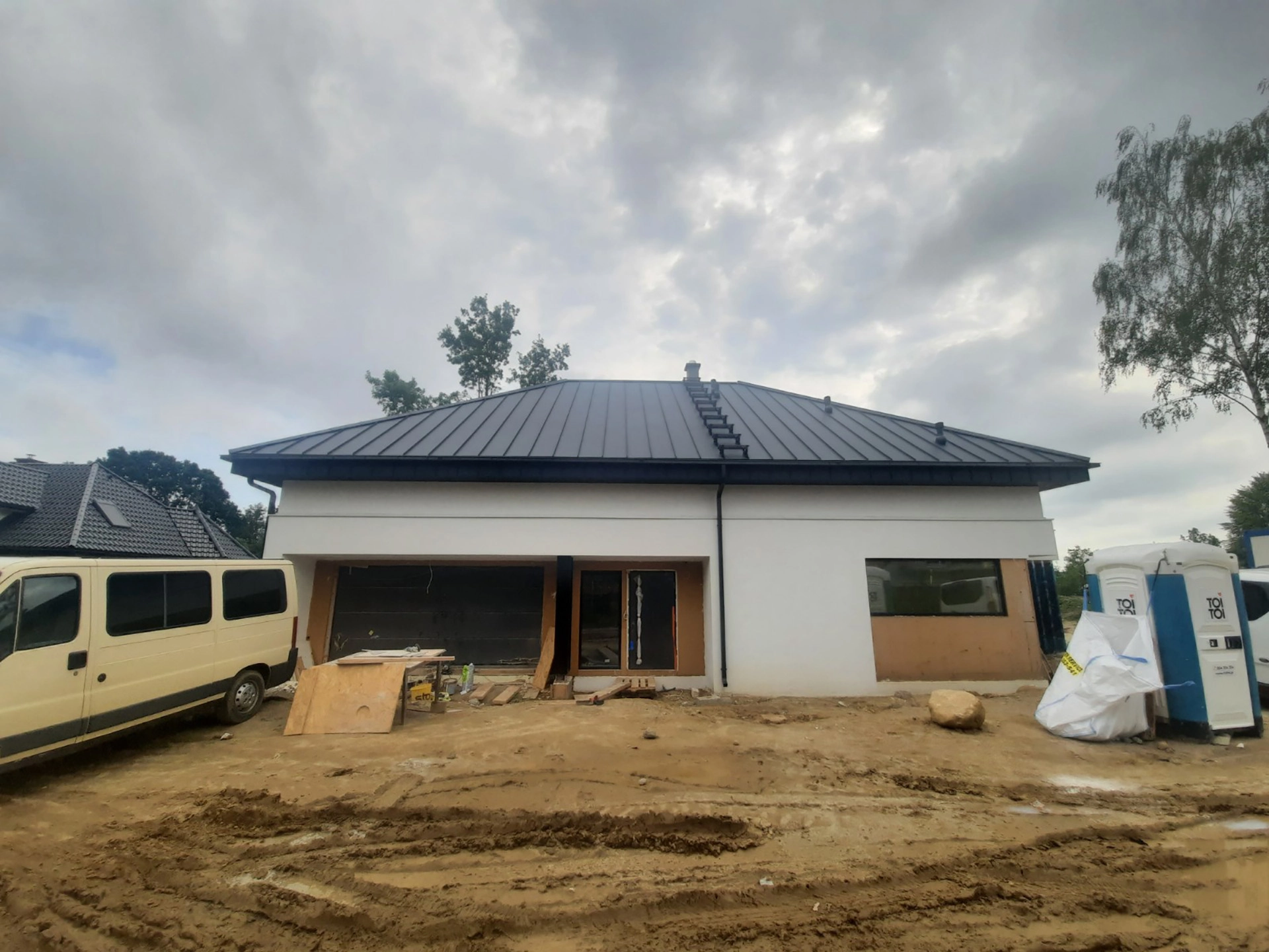 Budujemy nowoczesny dom prefabrykowany z użytkowym poddaszem na bazie projektu indywidualnego. Na parterze budynku znajdują się następujące pomieszczenia: przestronny salon, kuchnia, jadalnia, gabinet, łazienka, spiżarnia, pomieszczenie techniczne, wiatrołap oraz dwustanowiskowy garaż.