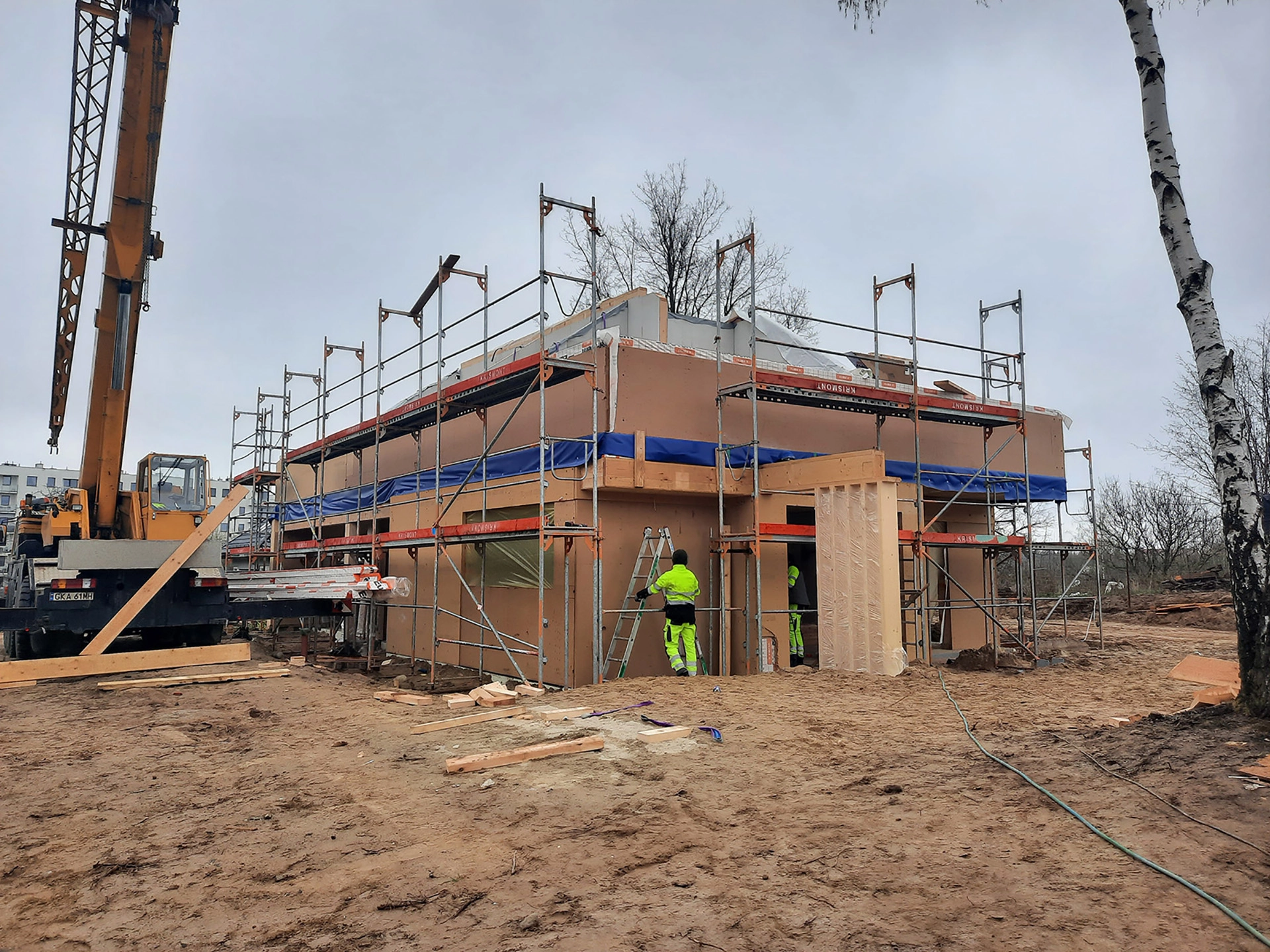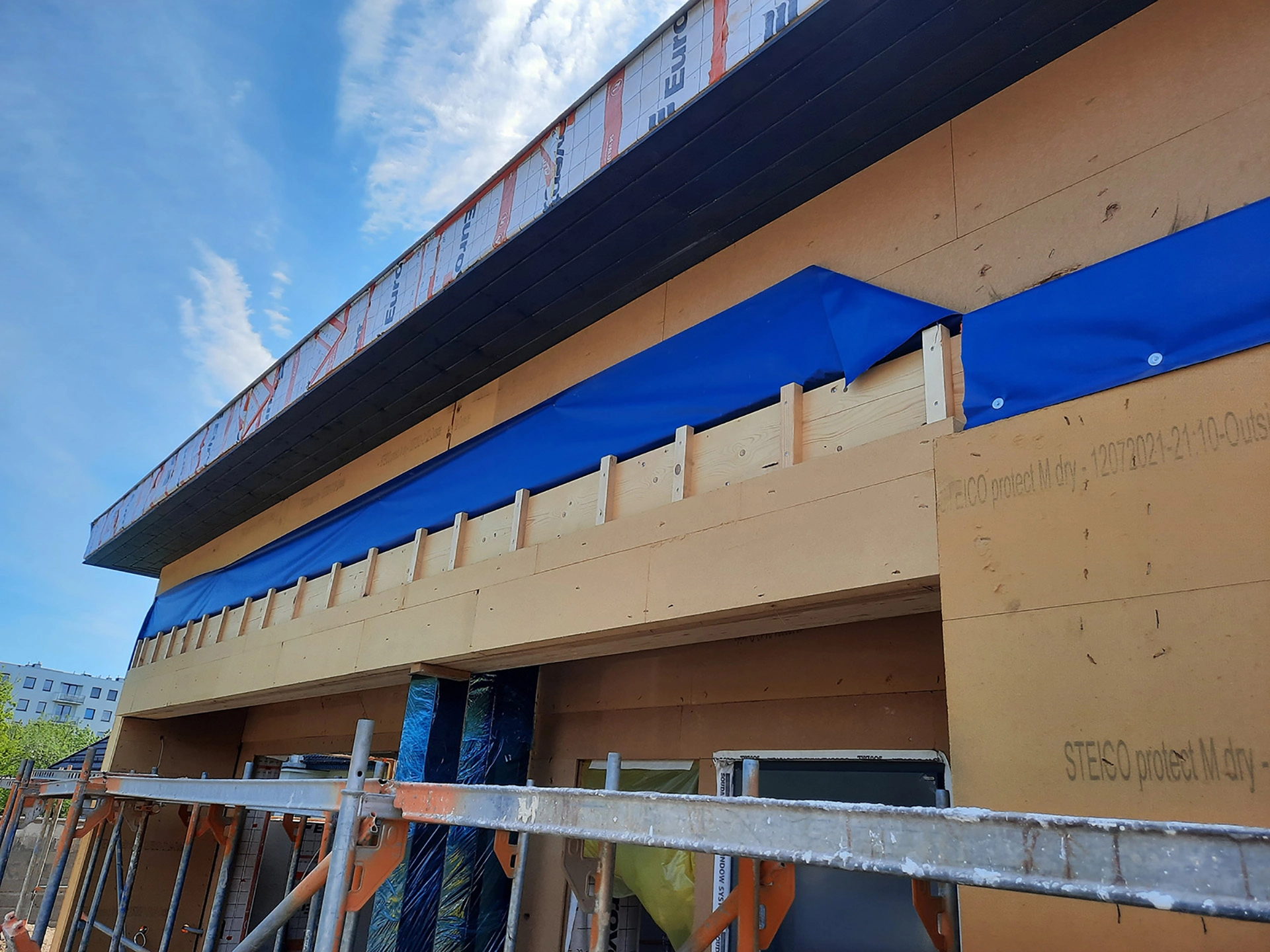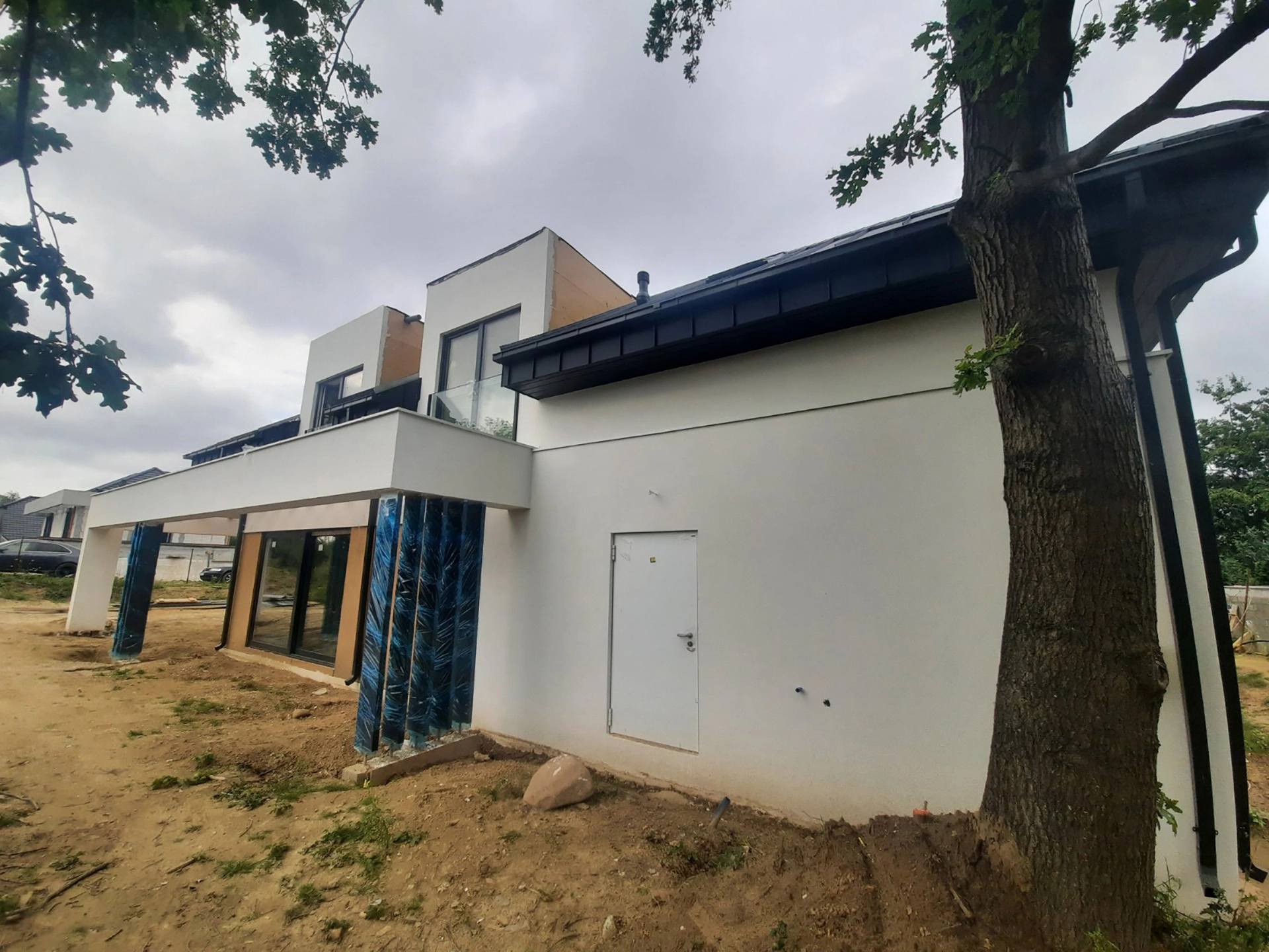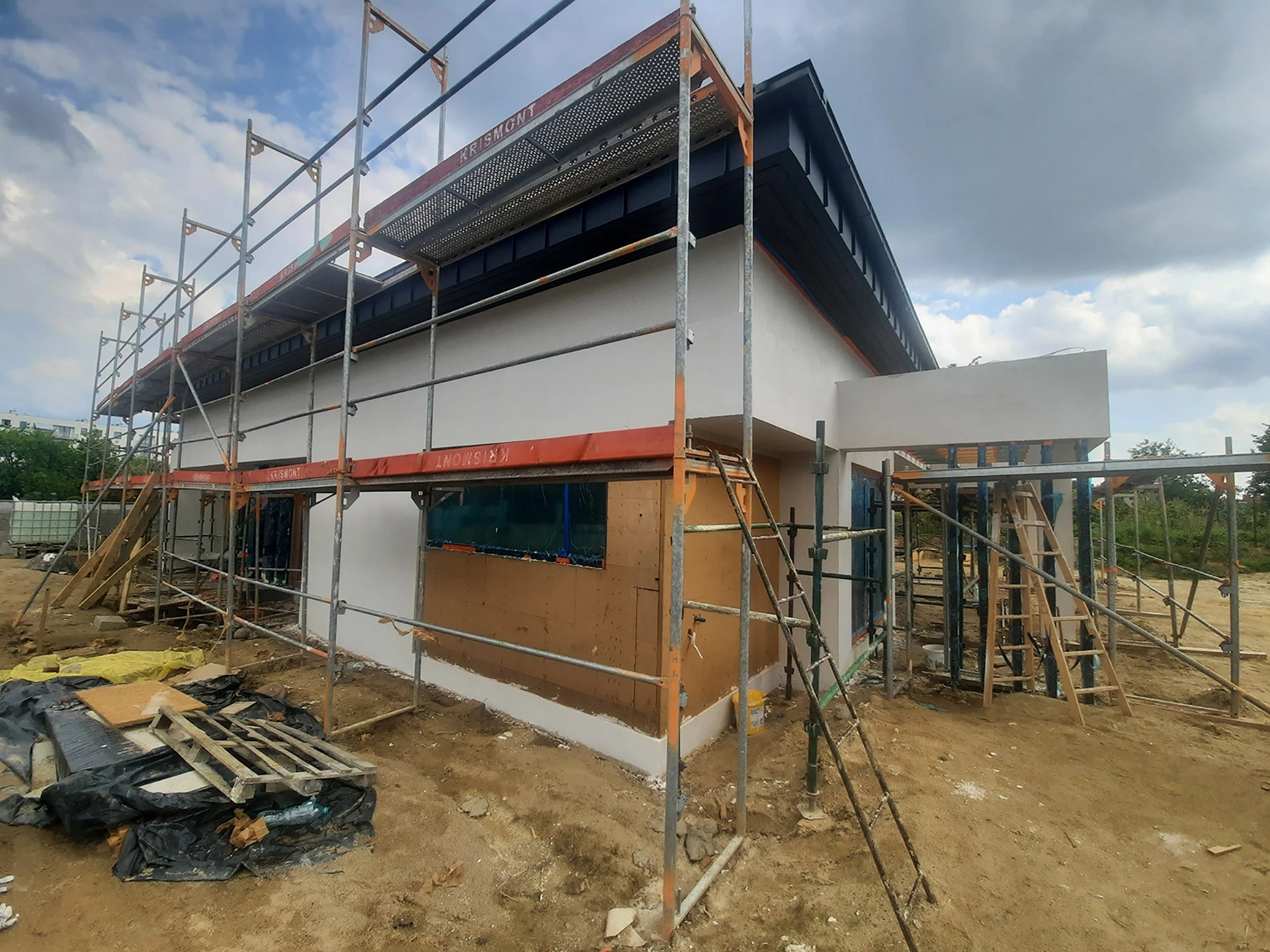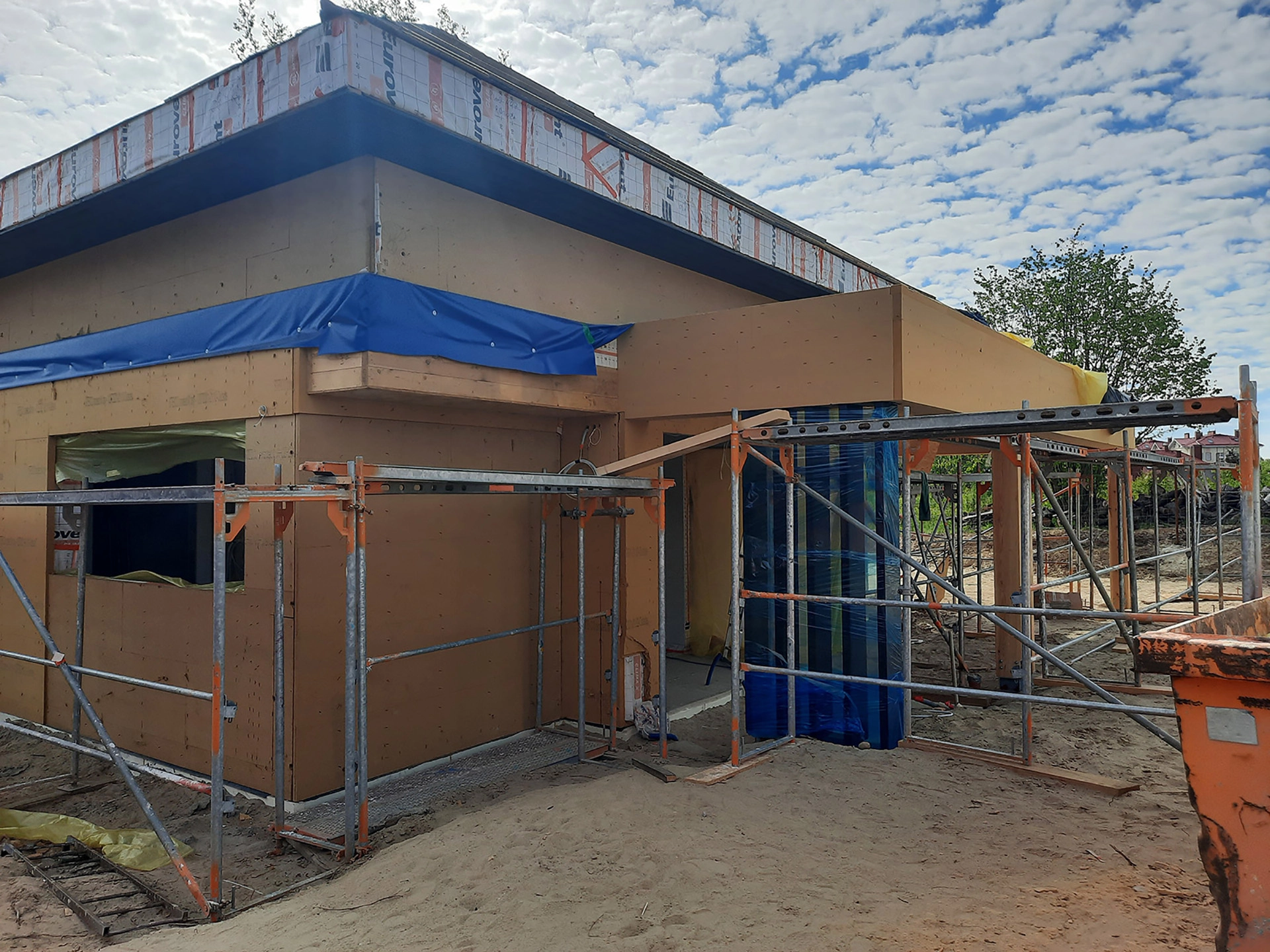 Obiekt zostanie standardowo wyposażony w system wentylacji mechanicznej z urządzeniem do odzysku ciepła z wywiewanego powietrza – rekuperatorem. Źródłem ogrzewania budowanego domu z prefabrykatów będzie dwufunkcyjny kocioł gazowy. Pokrycie dachowe zostanie wykonane z blachy panelowej na rąbek stojący w kolorze antracytowym. Projekt budowanego, energooszczędnego domu prefabrykowanego został sporządzony przez biuro Studio Kwadrat Beata i Paweł Jurago.
