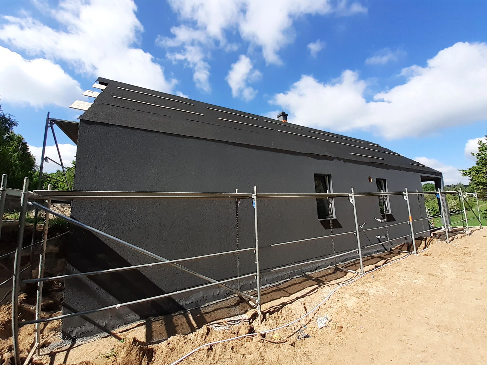 Realizacja ekologicznego domu z prefabrykatów drewnianych w powiecie Kartuskim (woj. pomorskie). Budynek parterowy o powierzchni blisko 110 m2 został posadowiony na energooszczędnej płycie fundamentowej – 20 cm izolacji na płytach termoizolacyjnych EPS Hydro, które chronią przed przemarzaniem i obciążeniami mechanicznymi. Zastosowane rozwiązania energooszczędne pozwalają znacznie ograniczyć koszty eksploatacji budynku (zwłaszcza ogrzewania) do minimum.